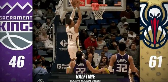 次节回来,琼斯迎着防守强投三分还中,锡安篮下又完成霸气补扣,鹈鹕一波9-0领先国王到14分。威少突破被切球失误,随后站在裁判身前抱怨,被吹罚技术犯规,‘赔了夫人又折兵’。雷诺突破挑篮命中,随后二次进攻补篮再得手,一人连拿6分止血,普劳登三分跳投命中后,威少反击快下突破上篮再打进,国王一波流追到8分分差。奎因跳投稳稳命中,墨菲急停三分也投进,半场战罢,鹈鹕61-46领先国王15分。