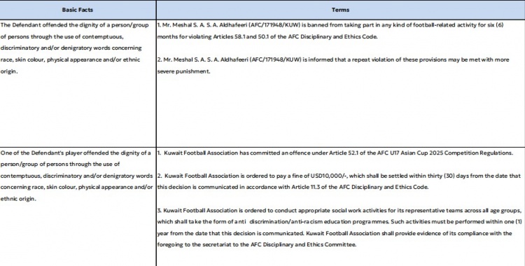 2025-03-17 16:02:57亚足联:科威特U17球员种族歧视行为被禁赛半年,足协罚款1万美元