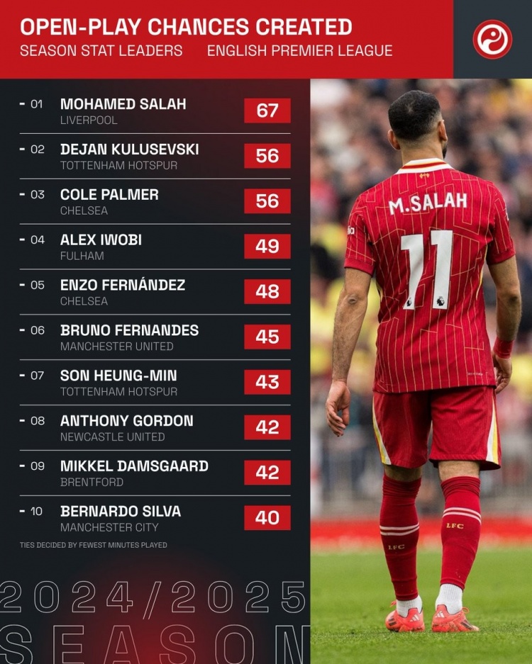 2025-03-19 02:38:34本赛季英超运动战创造机会榜:萨拉赫居首,帕尔默、B费、B席在列